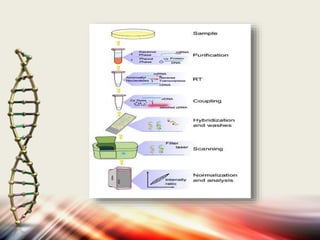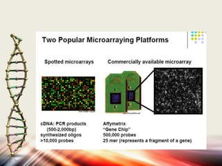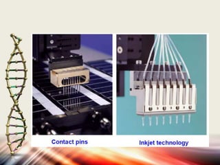 Microarrays allow researchers to analyze gene expression levels across thousands of genes simultaneously. DNA microarrays work by hybridizing fluorescently-labeled cDNA or cRNA to complementary DNA probes attached to a solid surface. This technology has applications in gene expression profiling, disease diagnosis, drug discovery, and toxicology research. While microarrays provide high-throughput analysis, their limitations include not reflecting true protein levels, complex data analysis, expense, and short shelf life of DNA chips.