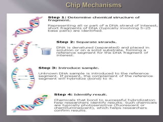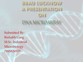 DNA microarrays are solid supports with organized grids of DNA probes that represent genes. Each DNA spot allows comparison of thousands of genes simultaneously. Microarray technology uses DNA chip probes to bind complementary DNA in samples, studying gene expression across entire genomes. Microarrays evolved from Southern blotting and were first used for eukaryotic gene expression profiling in 1995. Microarrays exploit DNA hybridization between nucleotide sequences to screen genomic sequences. They are used for gene expression profiling, drug discovery, diagnostics, and more.