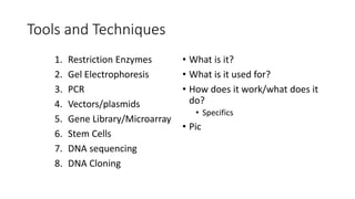 - Restriction enzymes, gel electrophoresis, PCR, vectors, gene libraries, and DNA sequencing which were used in the Human Genome Project to map the human genome.