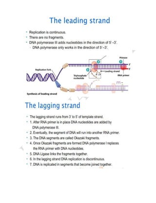 DNA replication is the process by which DNA copies itself. It involves unwinding the double helix and using each strand as a template to synthesize new complementary strands. Key enzymes involved include helicase, primase, DNA polymerase III, and ligase. DNA polymerase III is responsible for adding nucleotides to the new strands, while helicase unwinds the DNA and primase adds RNA primers. The process is semi-conservative, producing two DNA molecules each with one original and one new strand. Replication occurs through initiation, elongation, and termination stages and proofreading ensures high-fidelity copying of the genetic material.