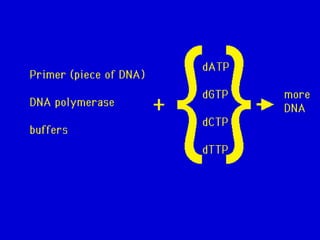 This document summarizes DNA replication. It describes the key requirements for replication like dNTPs, template DNA, primers, and magnesium ions. It explains that replication is semi-conservative, with each parental strand serving as a template for the daughter strands. It discusses the different models of replication and evidence from Meselson and Stahl's experiment supporting the semi-conservative model. It also provides details about replication proteins, the replication fork, and differences between prokaryotic and eukaryotic replication.