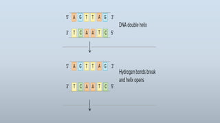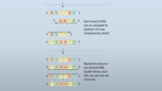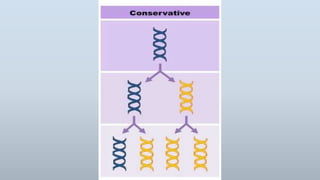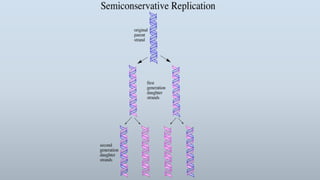 DNA replication is the process by which DNA makes a copy of itself during cell division. There are three models of DNA replication: semiconservative, conservative, and dispersive. In semiconservative replication, the two parental DNA strands separate and each acts as a template to make a new complementary strand, resulting in two double-stranded daughter molecules each with one original and one new strand. The steps of replication involve unwinding the DNA double helix, forming a replication fork, and synthesizing new strands in the 5' to 3' direction along the leading and lagging strands through the use of primers, DNA polymerase, and DNA ligase.