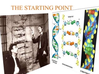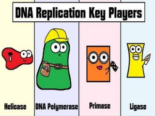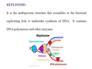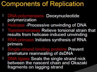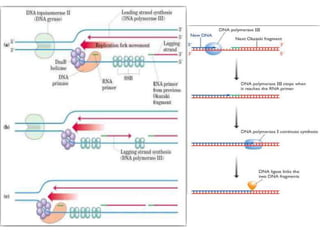 The document summarizes the process of DNA replication in prokaryotic cells like E. coli. It describes the three main stages: initiation at the Ori C origin site involving DnaA and DnaB proteins, elongation where the leading strand is synthesized continuously and the lagging strand requires RNA primers, and termination when the replication forks meet specific termination sites and DnaB is released. DNA replication allows faithful copying of the parental DNA to produce two identical progeny DNA molecules.