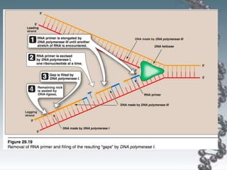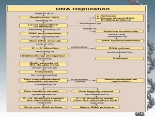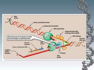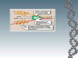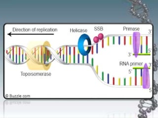 - The key enzymes involved are DNA helicase, topoisomerases, primase, DNA polymerase, and DNA ligase. DNA polymerase synthesizes new strands in the 5' to 3' direction using existing strands as templates.