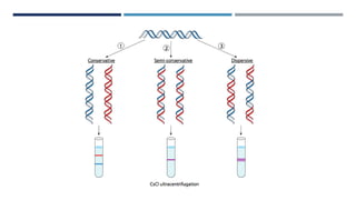 DNA replication is the process by which a parent DNA molecule makes two identical daughter DNA molecules. It is semi-conservative, meaning the parent DNA strands separate and each serves as a template for a new complementary daughter strand. Meselson and Stahl's experiment provided evidence for this semi-conservative model of replication. They grew E. coli in medium containing a heavy isotope of nitrogen, then switched to light nitrogen medium. After multiple generations, they found DNA bands corresponding to hybrid heavy-light DNA strands, supporting the semi-conservative model. DNA replication requires dNTPs, DNA polymerase and other enzymes, primers, and separation of the parental strands by helicase.