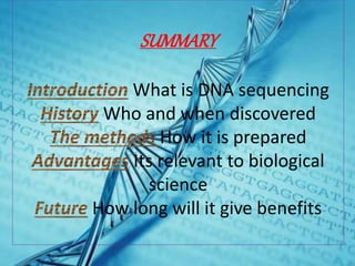 DNA sequencing is a process to determine the order of nucleotides in a DNA molecule. It was discovered in the 1970s by scientists like Frederick Sanger who developed the chain termination method. This method involves DNA replication with modified nucleotides that cause the growing DNA strand to terminate at that point. The fragments are then separated by size to reveal the sequence. Automated sequencing now uses fluorescent dyes and capillary electrophoresis for faster and higher throughput sequencing. DNA sequencing has applications in medicine, forensics, and agriculture.