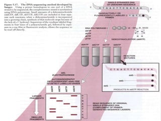 DNA sequencing determines the order of nucleotide bases in a DNA molecule. The first methods were developed in the 1970s by Maxam and Gilbert (chemical method) and Sanger (chain termination/dideoxy method). Sanger's method is now most commonly used and involves DNA synthesis with chain termination by dideoxynucleotides to generate fragments of different lengths that can be separated and read to determine the DNA sequence. DNA sequencing has revolutionized biological sciences by enabling diagnosis of genetic diseases, identification of disease-causing mutations, and mapping of genomes. It provides benefits for medicine, forensics, and agriculture.