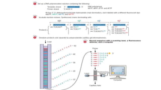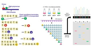Sanger sequencing, also known as chain termination sequencing, was developed in 1977 and involves DNA polymerase extending a primer until a dideoxynucleotide is incorporated, terminating DNA synthesis. The resulting fragments of different lengths are separated by gel electrophoresis and read to determine the DNA sequence. Maxam-Gilbert sequencing uses chemical reactions that selectively modify bases followed by piperidine cleavage, generating labeled fragments that are resolved on gels to reveal the DNA sequence. Both methods were crucial for determining DNA sequences in the Human Genome Project.