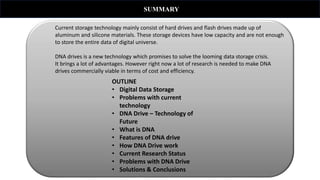 Current storage technology relies on hard drives and flash drives which have limited capacity and longevity. A new DNA-based storage technology called DNA drives promises significantly higher storage capacity and longevity by encoding data into DNA. However, DNA drives currently require extensive research to improve efficiency and reduce costs before they can become commercially viable for widespread data storage.