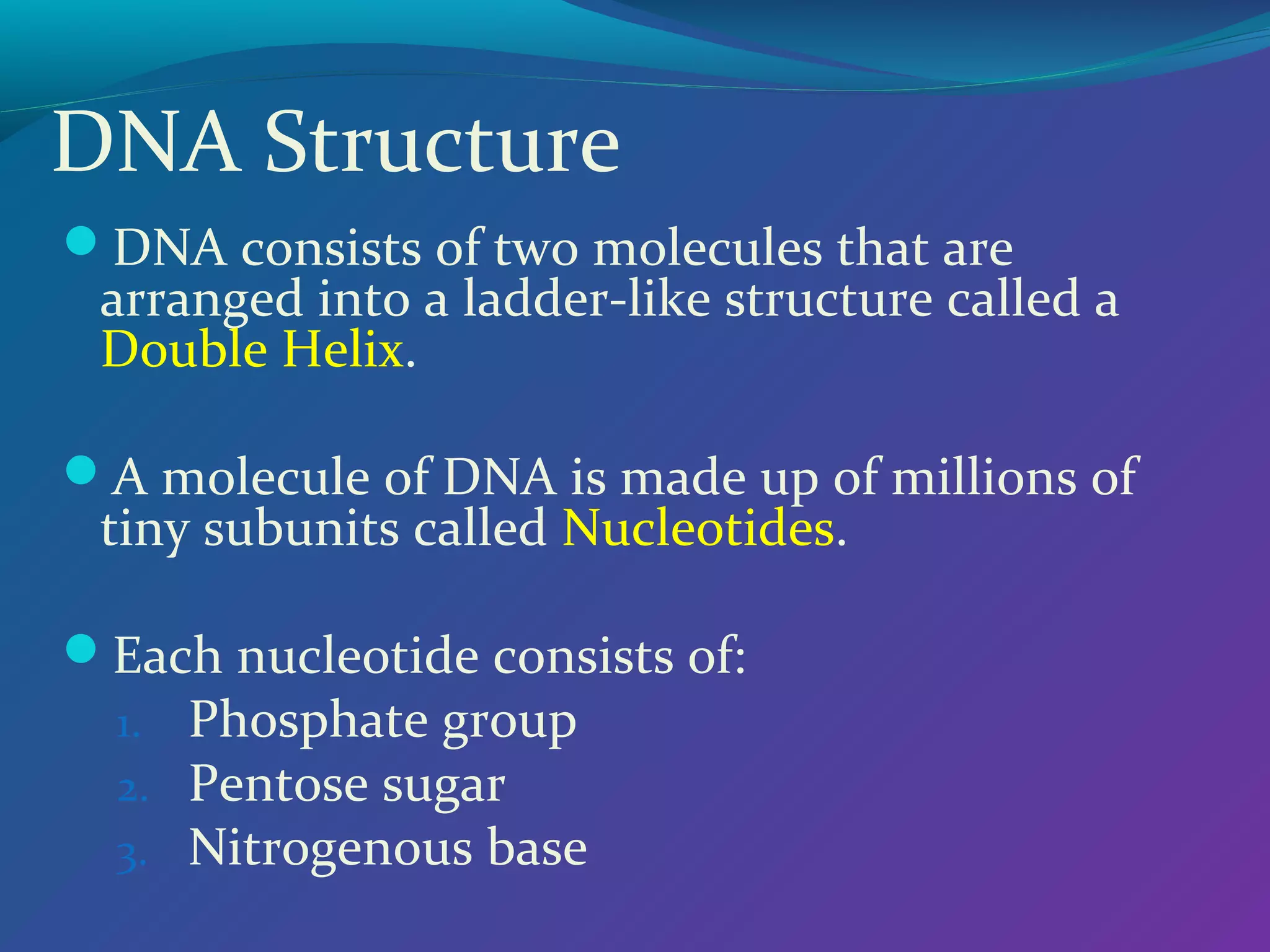 DNA consists of a double helix structure made up of nucleotides. Each nucleotide contains a phosphate, pentose sugar, and one of four nitrogenous bases (adenine, thymine, cytosine, guanine). The bases bond specifically with each other (A-T and C-G) to form base pairs between the two DNA strands. The sequence of these base pairs encodes genetic information and determines the sequence of amino acids in proteins.