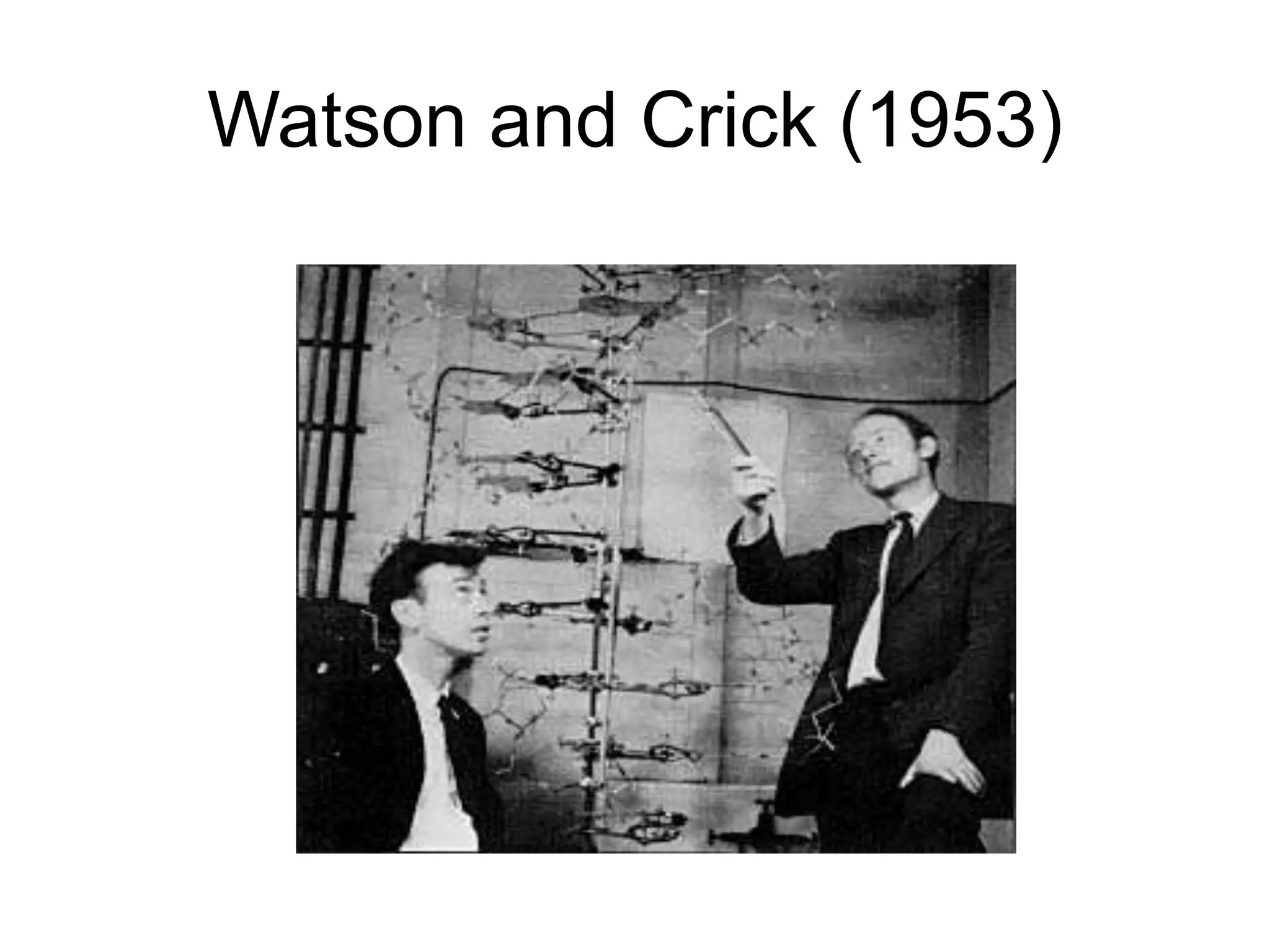 Watson and Crick discovered the double helix structure of DNA in 1953. Their model showed that DNA consists of two polynucleotide chains coiled around each other in a right-handed spiral. The bases of each chain bond with the other chain via hydrogen bonds in a base-pairing pattern where adenine pairs with thymine and cytosine pairs with guanine. This discovery helped explain how genetic information is stored and copied in organisms.