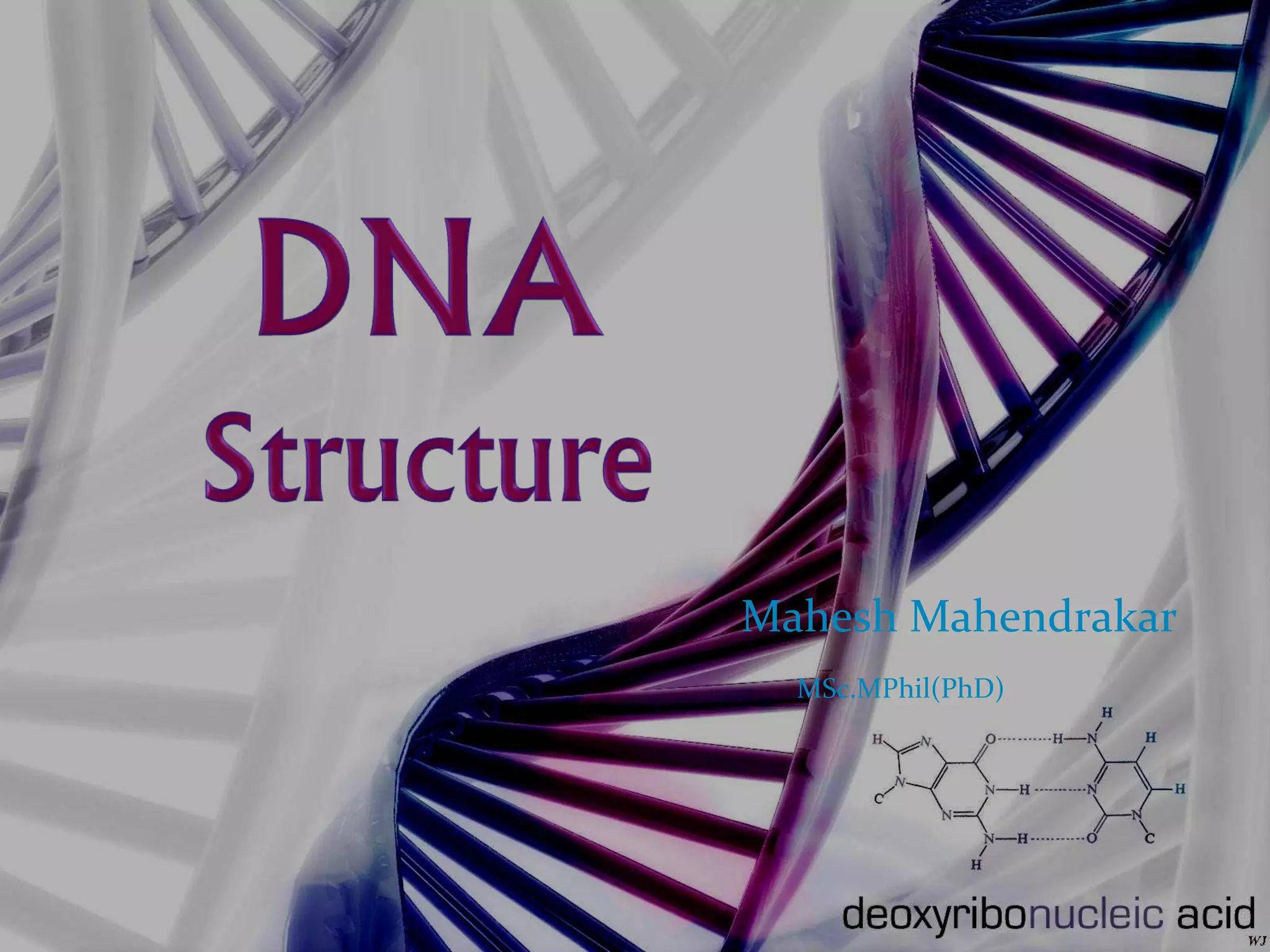 The document discusses the structure of DNA. DNA consists of two strands that form a double helix structure. DNA is made up of nucleotides, each containing a phosphate group, pentose sugar, and one of four nitrogenous bases: adenine, thymine, guanine, and cytosine. The bases bond specifically with each other to form base pairs between the strands. The sequence of bases in one strand determines the sequence in the other strand. Genes are sections of DNA that code for proteins, with each gene having a unique sequence that produces a unique protein and gives organisms their traits.