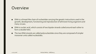 DNA is composed of nucleotides that form two helical strands bonded together. Each nucleotide contains a nitrogenous base, a sugar (deoxyribose), and a phosphate group. The nitrogenous bases on each strand bond with the bases on the other strand through hydrogen bonds, with adenine bonding with thymine and cytosine bonding with guanine. Together, the sugar-phosphate backbone and bonded nitrogenous bases form the double helix structure of DNA, which carries the genetic instructions for living organisms.