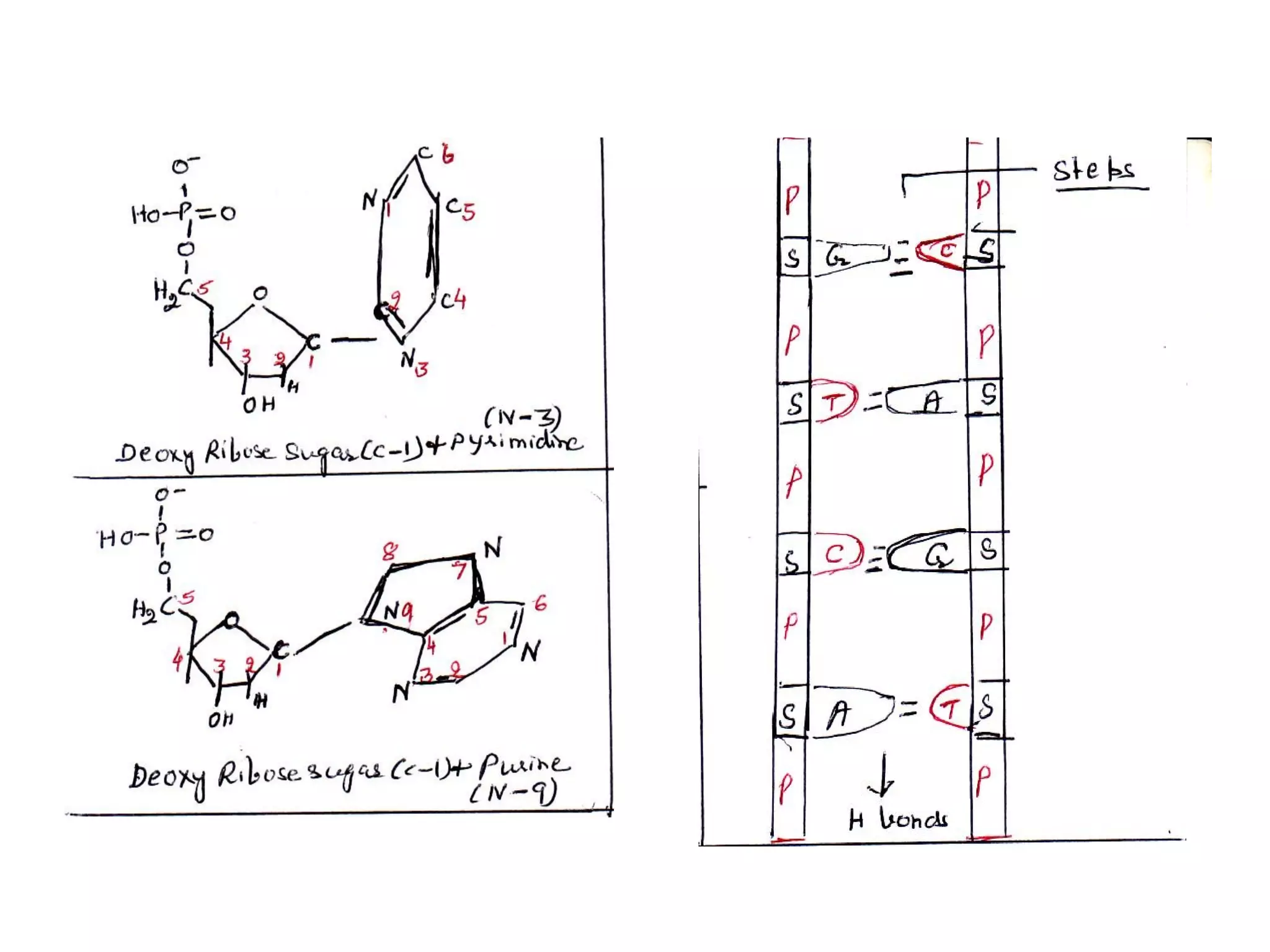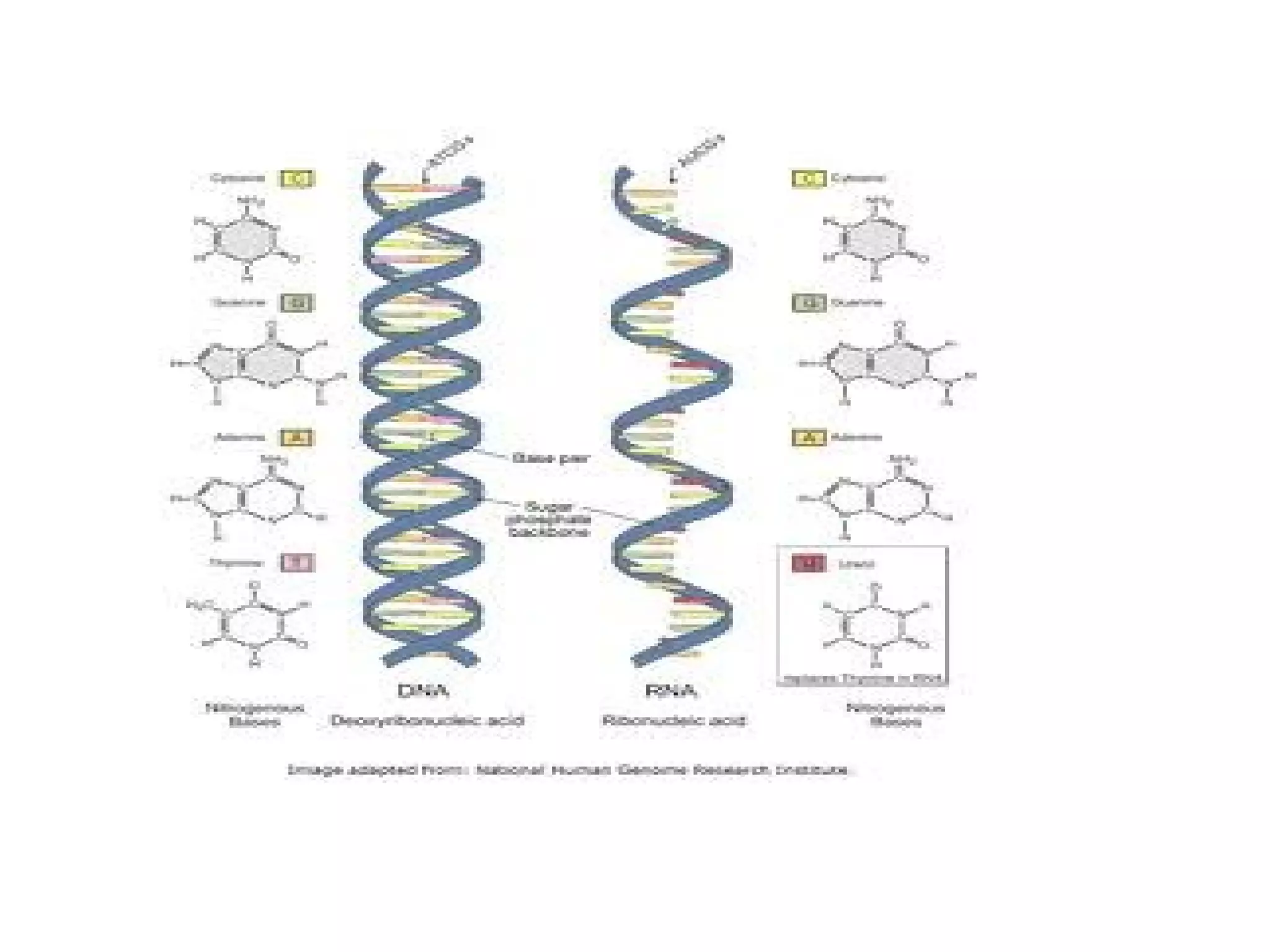 The document discusses the structure and discovery of DNA, detailing its components, helical structure, and the significance of base pairing in genetic replication and transcription. It outlines historical developments by various scientists including Watson, Crick, and Franklin, emphasizing Chargaff's rules regarding nucleotide pairing. Additionally, it compares DNA with RNA and highlights the stability and function of each type of nucleic acid.