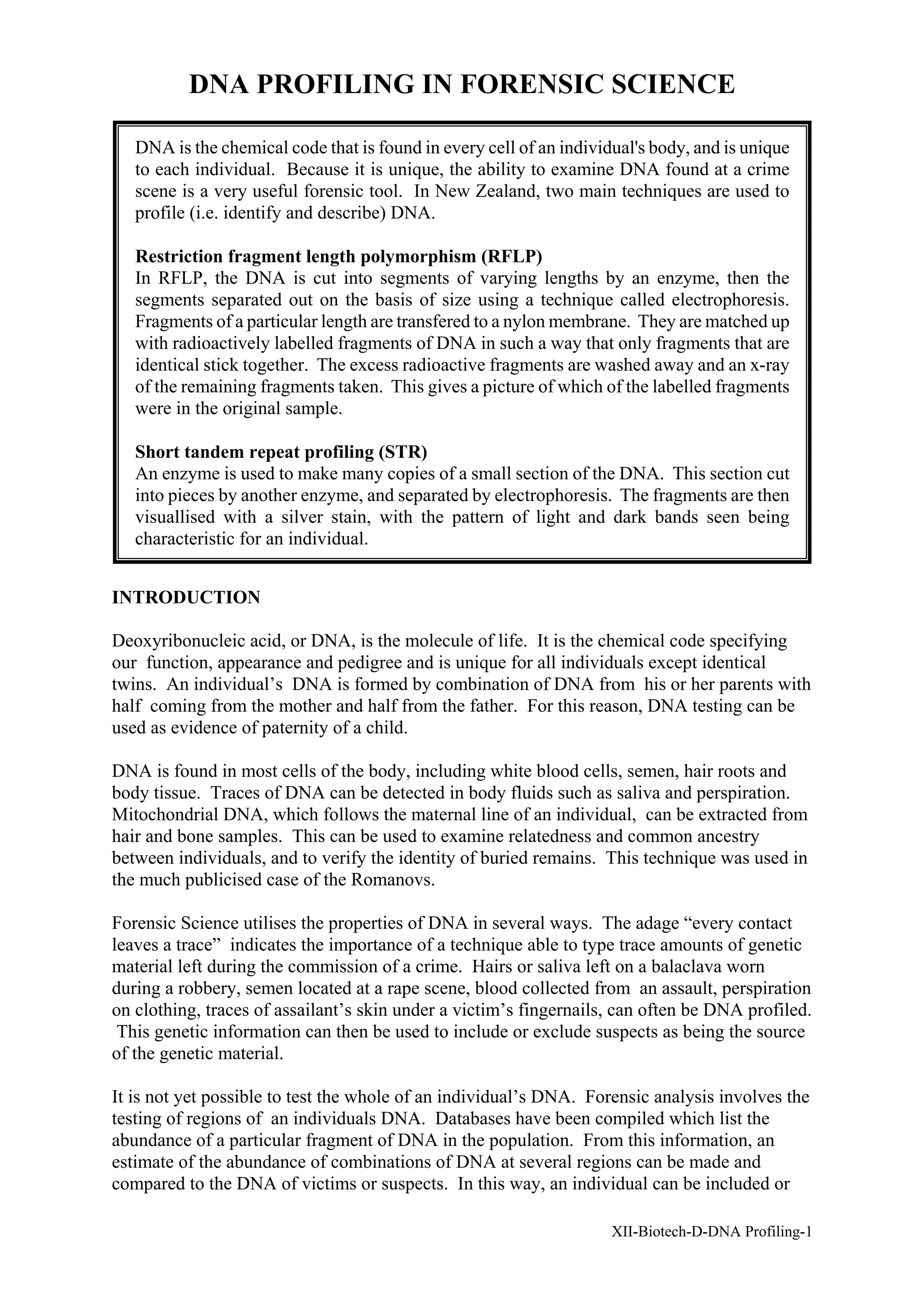 DNA profiling is a forensic technique that uses a person's unique DNA to identify them. It examines DNA found at crime scenes. Two main techniques are used: Restriction fragment length polymorphism cuts DNA into fragments of varying lengths, which are then compared to suspects' DNA. Short tandem repeat profiling makes copies of DNA sections and examines repetitive patterns that differ between people. DNA profiling is a powerful forensic tool that can include or exclude suspects by matching DNA evidence to their profiles.