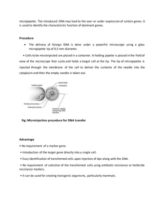 DNA transfer techniques involve transferring DNA segments into cells through various methods such as physical, chemical, electrical, and biological processes. Techniques like microinjection, particle bombardment, electroporation, and Agrobacterium-mediated transfer have unique procedures and applications, especially in creating transgenic organisms. Each method has its advantages and limitations, influencing its use in molecular biology and genetic engineering.
