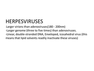 DNA viruses like poxviruses, herpesviruses, and hepatitis B viruses use DNA as their genetic material. Herpesviruses have larger virions and genomes than adenoviruses. They enter cells through fusion with the plasma membrane or endocytosis. During replication, herpesviruses use host enzymes to transcribe early genes that regulate expression of late genes for structural proteins. Virions assemble in the nucleus and acquire an envelope as they bud through the inner nuclear membrane. Viral genomes evolve through spontaneous or induced mutation during replication and by recombining genetic material within or between viruses through breaking and rejoining DNA or RNA.