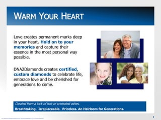 DNA2Diamonds creates custom lab-grown diamonds from cremated ashes or hair that can memorialize loved ones or pets. Their diamonds are gemologically identical to earth-mined diamonds but contain the essence of the individual. Customers can choose from various colors, cuts, carat sizes, and settings to create a unique and meaningful heirloom to commemorate life events and celebrate relationships. DNA2Diamonds aims to provide an exceptional customer experience and guarantees their eco-friendly and conflict-free diamonds are certified by gemological laboratories.