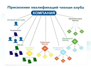 Маркетинг-план компании «dnaclub» предлагает возможность членам клуба зарабатывать, приобретая продукцию и приглашая новых участников. Члены могут получать премии с различных уровней структуры, а также бонусы по квалификациям, исходя из объемов продаж и активности. Для получения всех премий необходимо выполнить определенные условия, включая минимальную закупку продукции и наличие четырех активных бизнес-партнеров в первой линии.