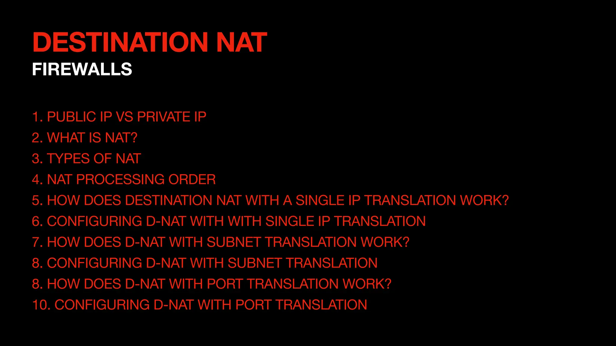 This document outlines the concepts and configurations related to destination Network Address Translation (D-NAT), including key topics like public vs private IP addresses, types of NAT, and processing order. It covers various configurations for D-NAT scenarios, including single IP translation, subnet translation, and Port Address Translation (PAT), and emphasizes the application of D-NAT policies in Junos. Troubleshooting guidelines for D-NAT are also provided to ensure correct configurations and functionality.