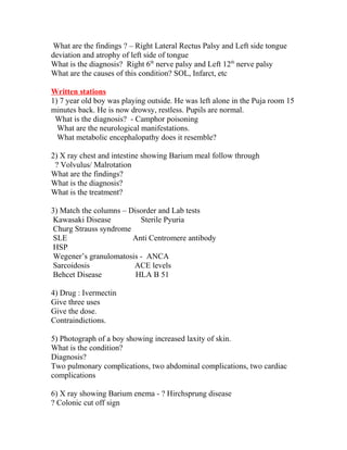 This document outlines 20 stations for a pediatric OSCE exam, including questions on resuscitation, physical exams, teaching a mother about insulin administration, history taking, reviewing videos, x-rays, EEGs, growth charts, hematology slides, reflex exams, and more. Exam topics assess candidates' abilities in areas such as diagnosis, treatment, clinical findings, drug choices and contraindications, inheritance patterns, and statistical analyses. Stations involve written questions, photographs, videos, and physical exams to comprehensively evaluate pediatric medical knowledge and skills.