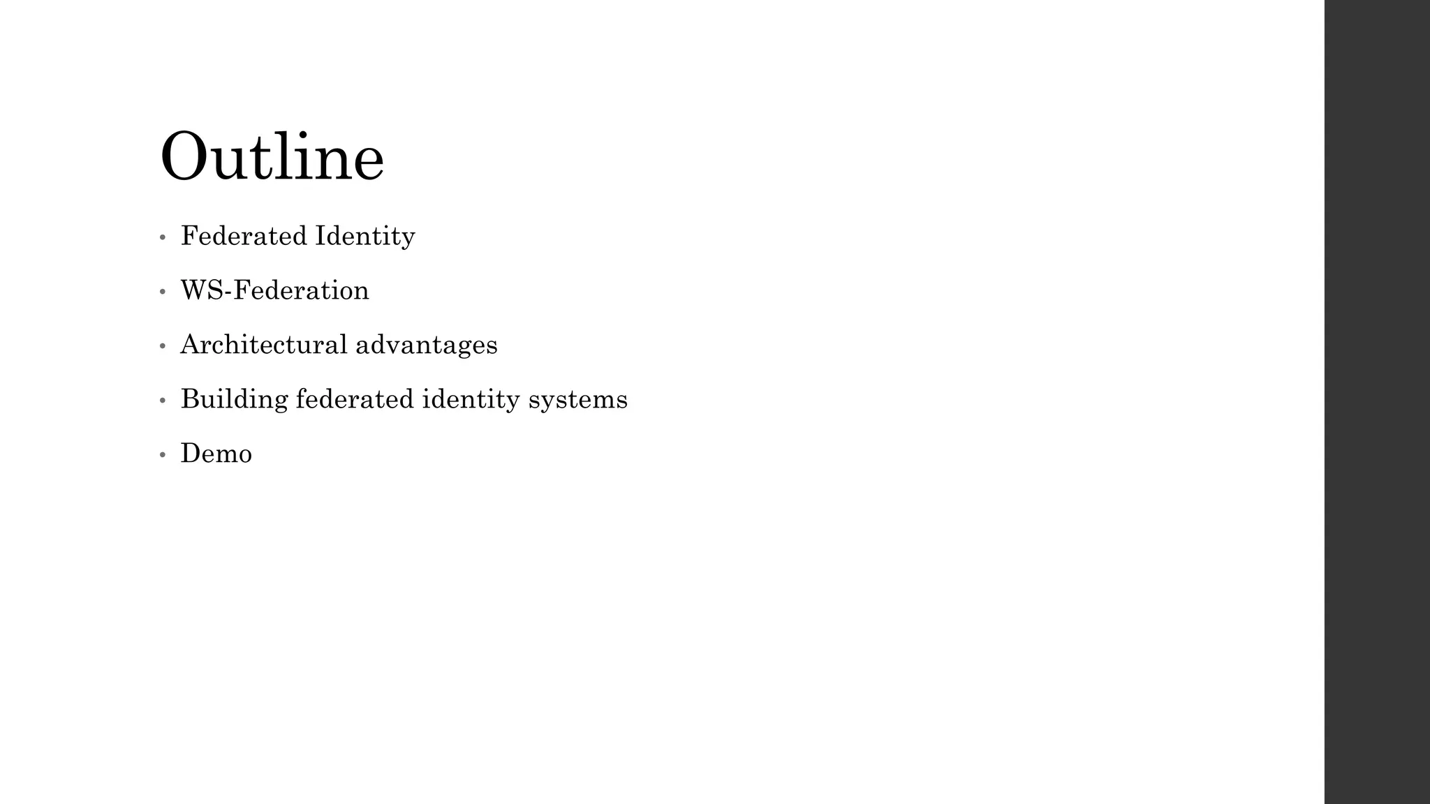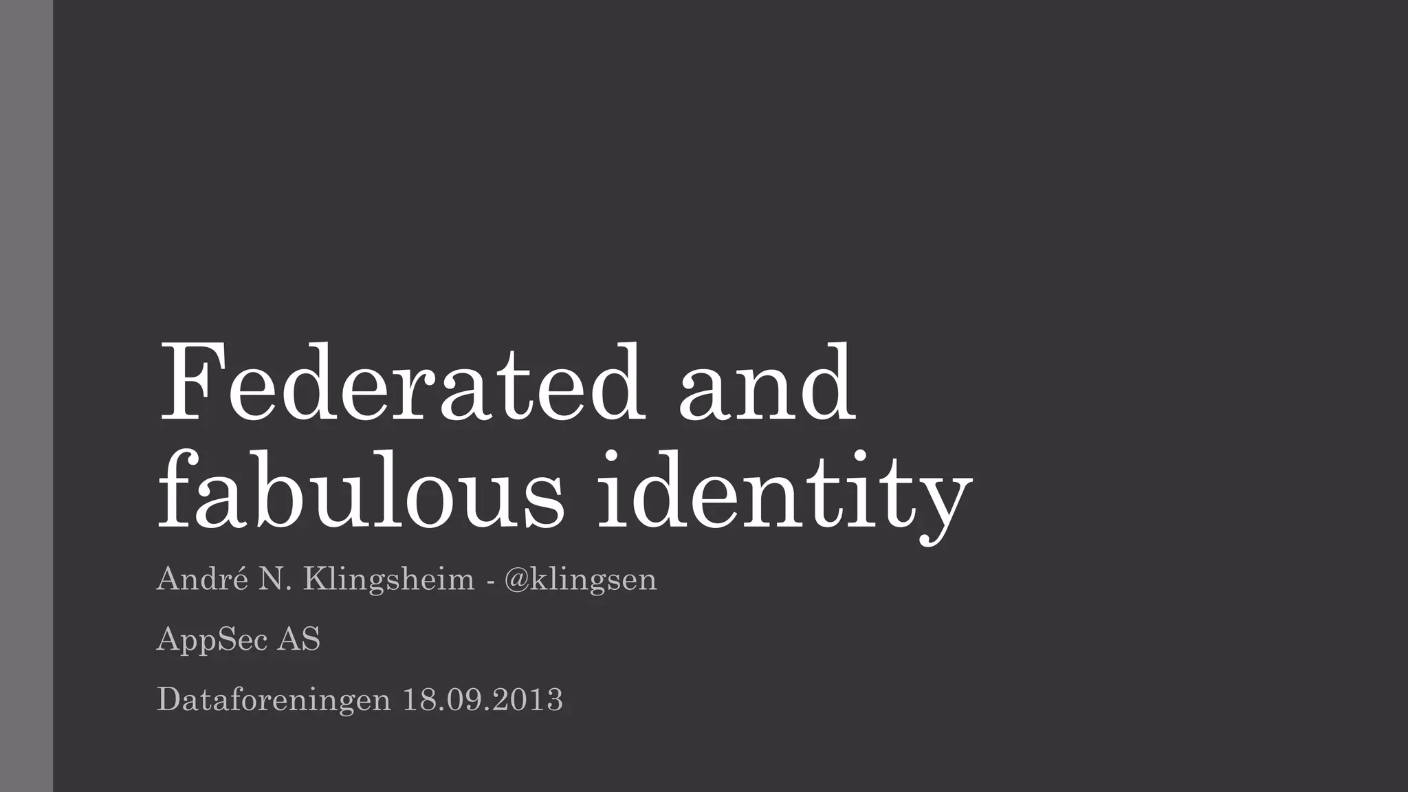 This document discusses federated identity and how it allows different companies to provide access to resources based on a user's identity asserted by another company. It describes how WS-Federation is an industry standard that defines mechanisms for security realms to federate. Key components of federated identity systems are discussed, including identity providers, security token services, relying parties, and security tokens that contain claims about a user. Architectural advantages of federated identity like single sign-on and flexibility in building applications are highlighted. Windows Identity Foundation and Active Directory Federation Services are presented as frameworks for building federated identity applications.