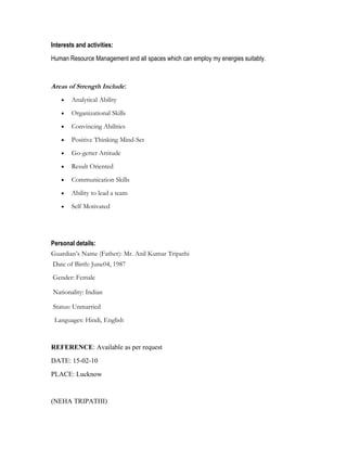 Neha Tripathi is pursuing a PGDM-HR from Babu Banaras Das National Institute of Technology in Lucknow, Uttar Pradesh. She has a Bachelor's degree in Computer Application from Sikkim Manipal University. Her career objective is to fully utilize her abilities through her work and contribute to organizational and societal goals. She has experience in marketing management from a training program and in human resources from an internship at Bharti Airtel. She also participated in various extracurricular activities like singing, dancing, and computer quizzes.