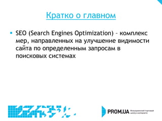Документ охватывает аспекты SEO для продвижения сайтов на платформе prom.ua, включая преимущества и недостатки SEO, этапы оптимизации, подбор ключевых слов и работу с контентом. Основное внимание уделяется внутренней и внешней оптимизации, а также правильному использованию метатегов и ссылок для повышения видимости сайта. Также рассматриваются рекомендации по избежанию санкций и недочётам в стратегиях продвижения.