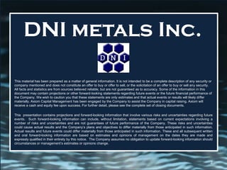 DNI Metals Inc. owns a graphite property in Madagascar that has the potential for low-cost, high-margin graphite production due to its large flake, high-purity, saprolite-hosted deposit that is located near infrastructure. The company plans to complete resource drilling and a preliminary economic assessment in 2017 to advance the project towards near term production, targeting an initial 12,000 tonnes per year. DNI believes the project's large flake graphite, low operating costs of $300-500 per tonne, and low $12 million capital costs provide it with strong competitive advantages in the natural graphite market.