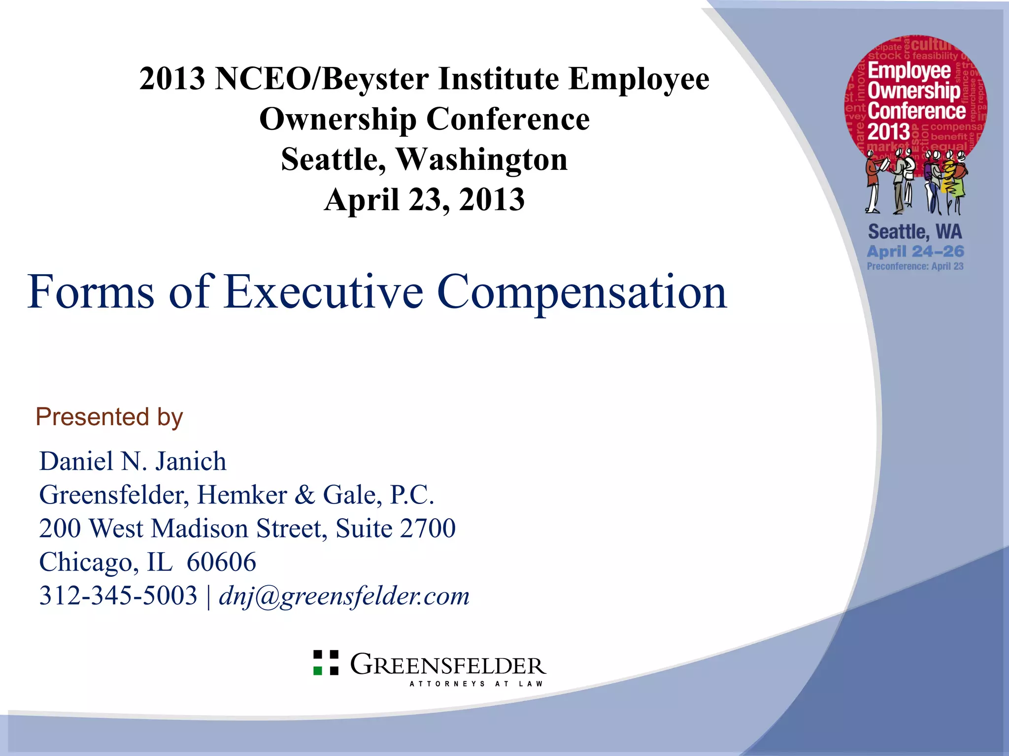 Daniel Janich presented on forms of executive compensation for privately-held companies. Executive compensation has grown more complex due to regulations like Sarbanes-Oxley, Section 409A, and securities laws. Privately-held companies need experienced advisors and a compensation philosophy when determining compensation. Components of compensation include salary, bonuses, deferred compensation, equity incentives, and benefits. Equity plans for S corporations require special consideration of Section 409(p)'s rules regarding disqualified individuals and nonallocation years.