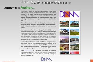 The document discusses how new technologies are transforming architectural practice and the architect's role. It describes the author's background working in both architecture and software development. Integrated 3D modeling allows architects to simulate buildings throughout their lifecycles, accelerating the design process but not creativity itself. While technologies change the traditional boundaries between design phases, they reduce documentation work and allow architects to provide ongoing services through a building's use.