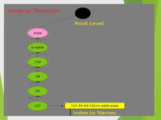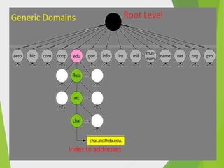 The document provides an overview of the Domain Name System (DNS). It discusses how DNS was developed to solve problems with the early HOSTS.TXT file system for mapping names to IP addresses. DNS implements a distributed database hierarchy with name servers, resolvers, and a namespace to translate between hostnames and IP addresses. The document outlines the components of DNS and how the domain name resolution process works by querying multiple name servers in a recursive manner to ultimately return an IP address.
