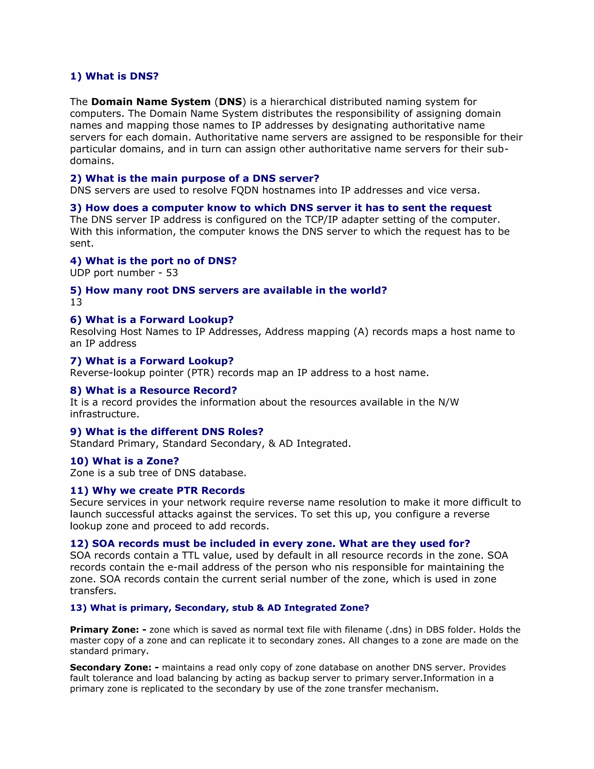 1) DNS is a hierarchical distributed naming system that maps domain names to IP addresses through authoritative name servers responsible for particular domains and subdomains.