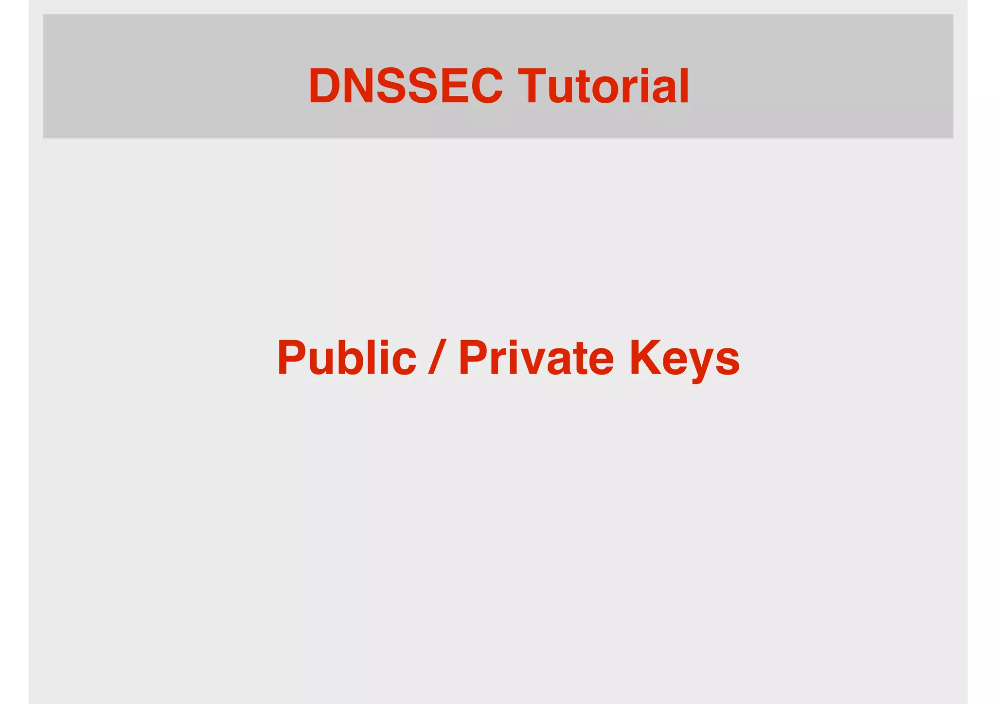 This document provides an overview of key concepts in DNSSEC including public/private keys, message digests or hashes, and digital signatures. It explains that public/private key pairs are used, where the private key is kept secret and the public key can be freely distributed. It also describes how one-way hashing functions work to generate fixed-length hashes from variable-length data, and how digital signatures are created by encrypting a message hash with a private key. These three concepts of public/private keys, hashes, and digital signatures form the basis of cryptographic techniques used in DNSSEC.