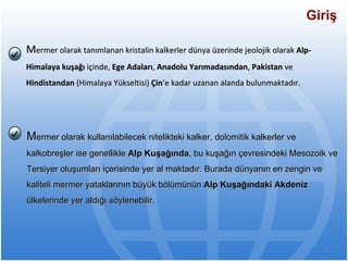M ermer olaraktanımlanan kristalin kalkerler dünya üzerinde jeolojik olarak Alp-Himalaya kuşağı içinde, Ege Adaları , Anadolu Yarımadasından , Pakistan ve Hindistandan (Himalaya Yükseltisi) Çin ’e kadar uzanan alanda bulunmaktadır. Giriş M ermer olarak kullanılabilecek nitelikteki kalker, dolomitik kalkerler ve kalkobreşler ise genellikle Alp Kuşağında , bu kuşağın çevresindeki Mesozoik ve Tersiyer oluşumları içerisinde yer al maktadır. Burada dünyanın en zengin ve kaliteli mermer yataklarının büyük bölümünün Alp Kuşağındaki Akdeniz ülkelerinde yer aldığı söylenebilir.