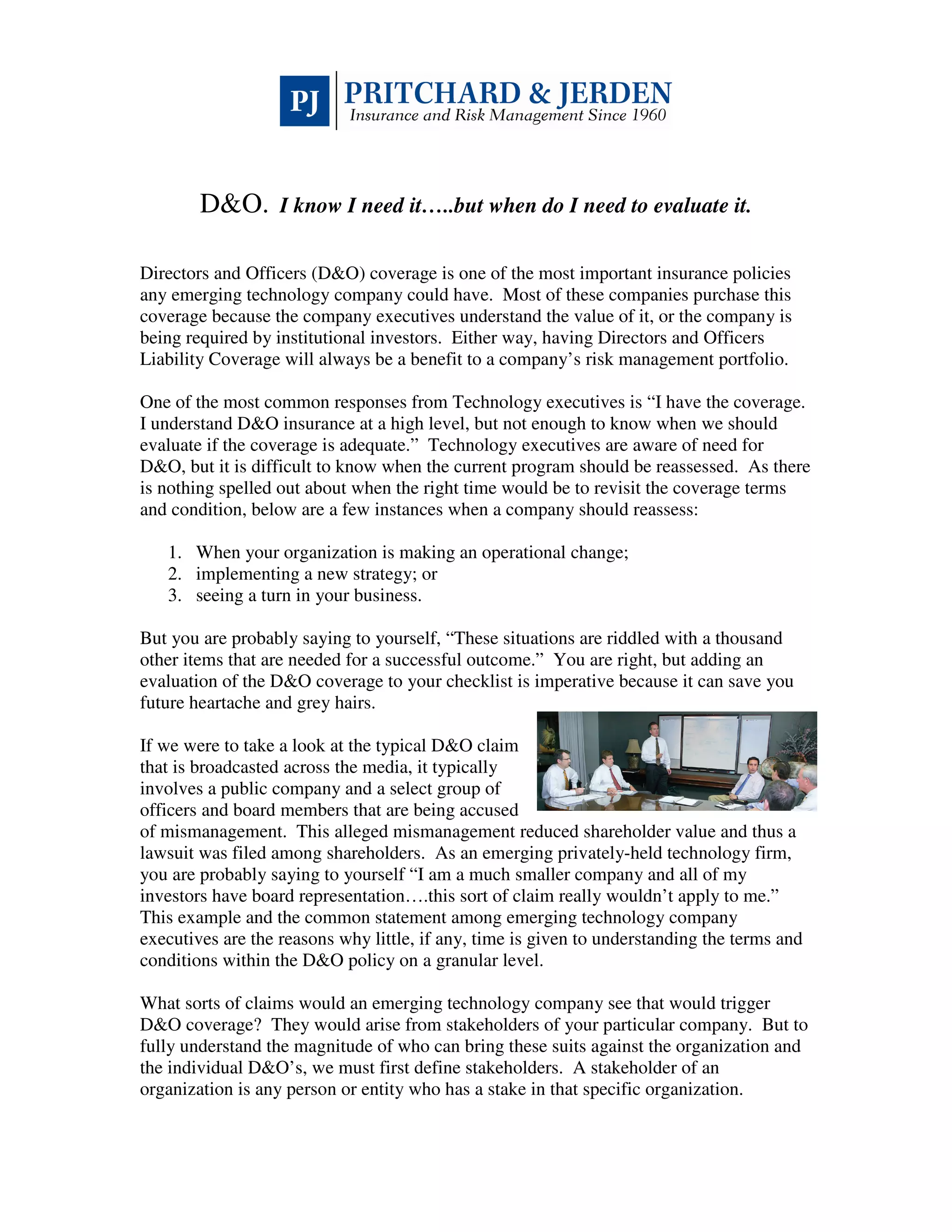 Directors and Officers (D&O) insurance is important for technology companies to protect against shareholder lawsuits. While many tech executives understand the need for D&O coverage at a high level, they may not know when to reevaluate the policy. The document provides guidance on common times to reassess D&O coverage, such as when making operational changes, implementing new strategies, or experiencing business shifts. Technology companies should work with their broker to regularly review D&O limits and terms as the business evolves to ensure ongoing protection from potential stakeholder claims.