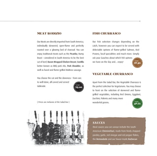 This menu offers a wide selection of hot and cold dishes from a salad bar buffet as well as meat, fish, and vegetable options cooked over open flames. Beverages include soft drinks, juices, smoothies, coffees, and an extensive list of cocktails, beers, wines, spirits, and liquors. The menu provides global flavors with an emphasis on Brazilian specialties.