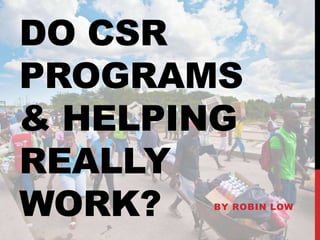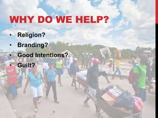 The document discusses the complexities and challenges of corporate social responsibility (CSR) and disaster relief efforts, highlighting that well-intentioned help often leads to unintended negative consequences. It presents examples from Nepal and Haiti, emphasizing the importance of local engagement, dignity, and innovative approaches in recovery efforts, rather than traditional top-down methods. The document advocates for a shift towards empowering disaster survivors and leveraging local resources to foster sustainable recovery and resilience.