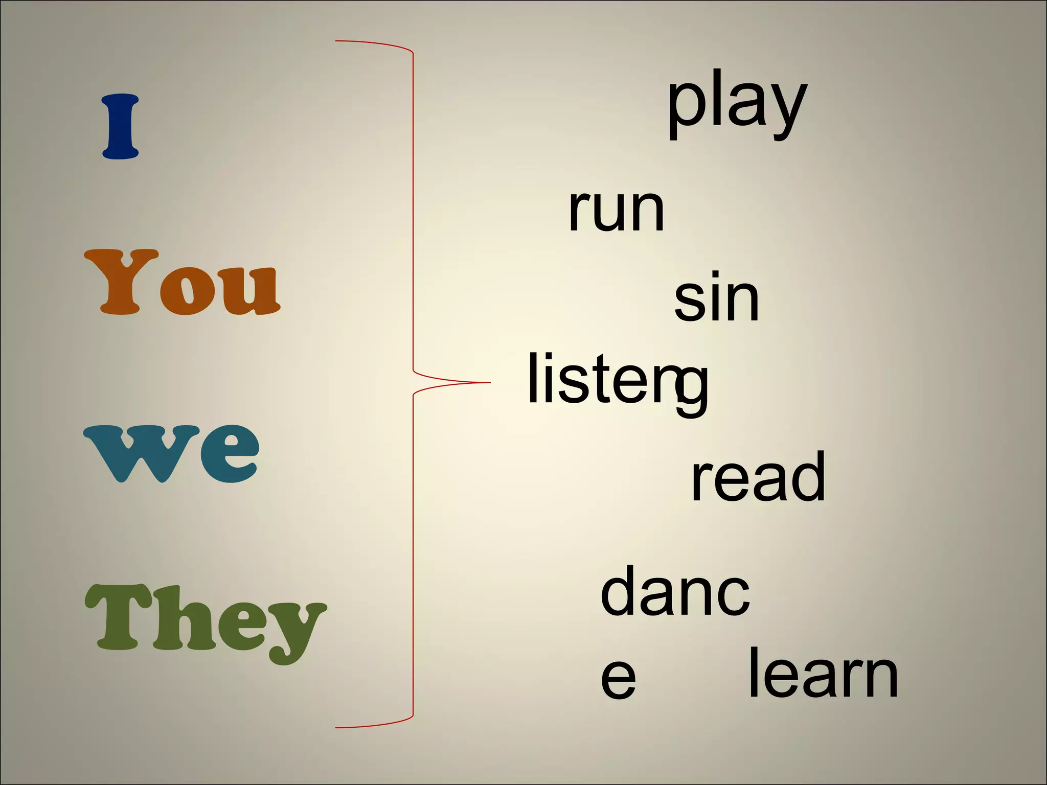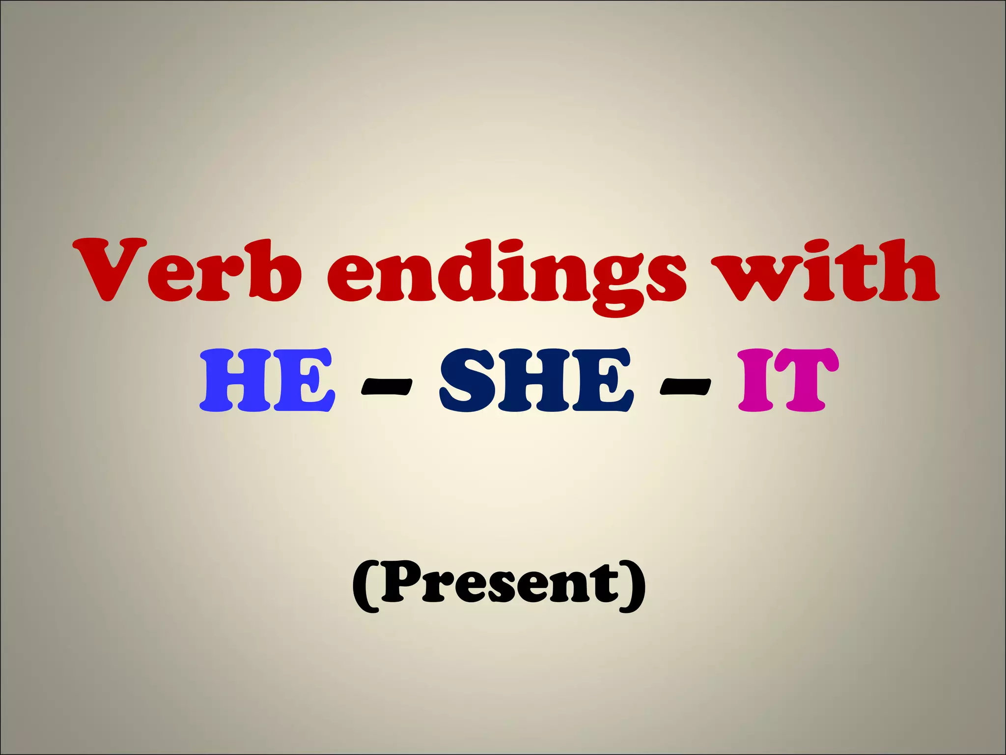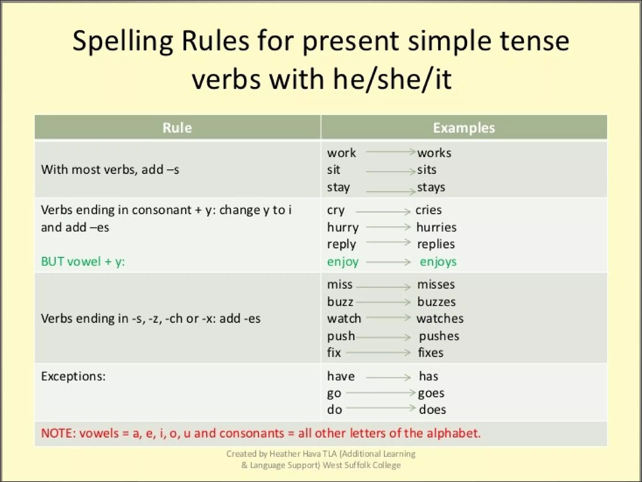 The document provides examples of verb conjugations for present tense in English. It shows the verb endings for "he", "she" and "it" compared to other pronouns like "I", "you", "we" and "they". It also includes examples of common verbs like "play", "run", "eat" and "sleep" with their correct endings for different subjects. Additionally, it demonstrates how to form yes/no questions by switching the verb and subject in sentences.