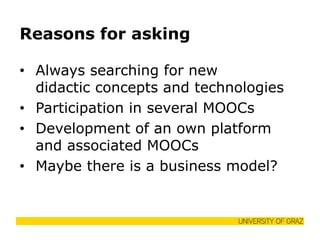 This document discusses the instructional design of Massive Open Online Courses (MOOCs). It notes that MOOCs require a distinct instructional approach due to their open nature and heterogeneous participants. The document outlines guidelines for developing MOOCs, including 7 categories: core requirements, structure, participant requirements, assignments, media design, communication, and resources. It emphasizes consistent design, selecting topics for broad audiences, testing activities/assignments, and clarifying certification. MOOCs are seen as needing either a connectivist approach emphasizing interaction, or an extension of traditional online lectures.