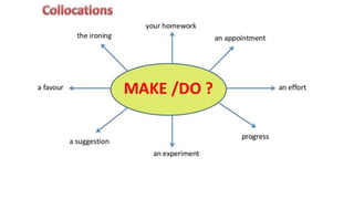 The document discusses the differences between using "do" and "make" when describing actions and tasks. It states that "do" is used to describe indefinite activities, duties, jobs, or leisure activities, while "make" refers to constructing, creating, or accomplishing something tangible. It provides examples of phrases using each verb and instructs the reader to form questions using the given expressions.