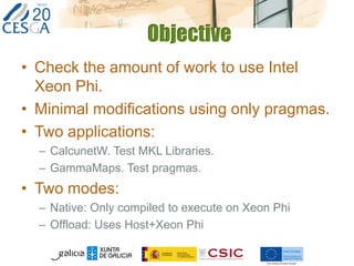 This document discusses lessons learned from porting two applications, CalcuNetW and GammaMaps, to the Intel Xeon Phi coprocessor. CalcuNetW calculates measurements in complex networks using MKL libraries, while GammaMaps performs dose calculations for radiation therapy using OpenMP pragmas. Both applications saw performance improvements when run natively on the Xeon Phi, with one Phi providing similar performance as one host Xeon CPU. However, I/O performance was poor on the Phi. With minimal code changes like pragmas, basic performance gains were achieved, but more work is needed for full optimization.
