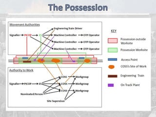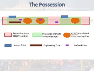 This presentation discusses risks to track workers from being struck by trains and barriers to improving safety. It analyzes fatality data and rules/controls governing track worker safety. Key issues include rules not derived from risk assessment; lack of defined processes for route setting and situational awareness in possessions; need for improved lookout protection systems and COSS competencies tailored to possessions. The presentation suggests developing a possession safety handbook and portable lookout warning systems to enhance safety.