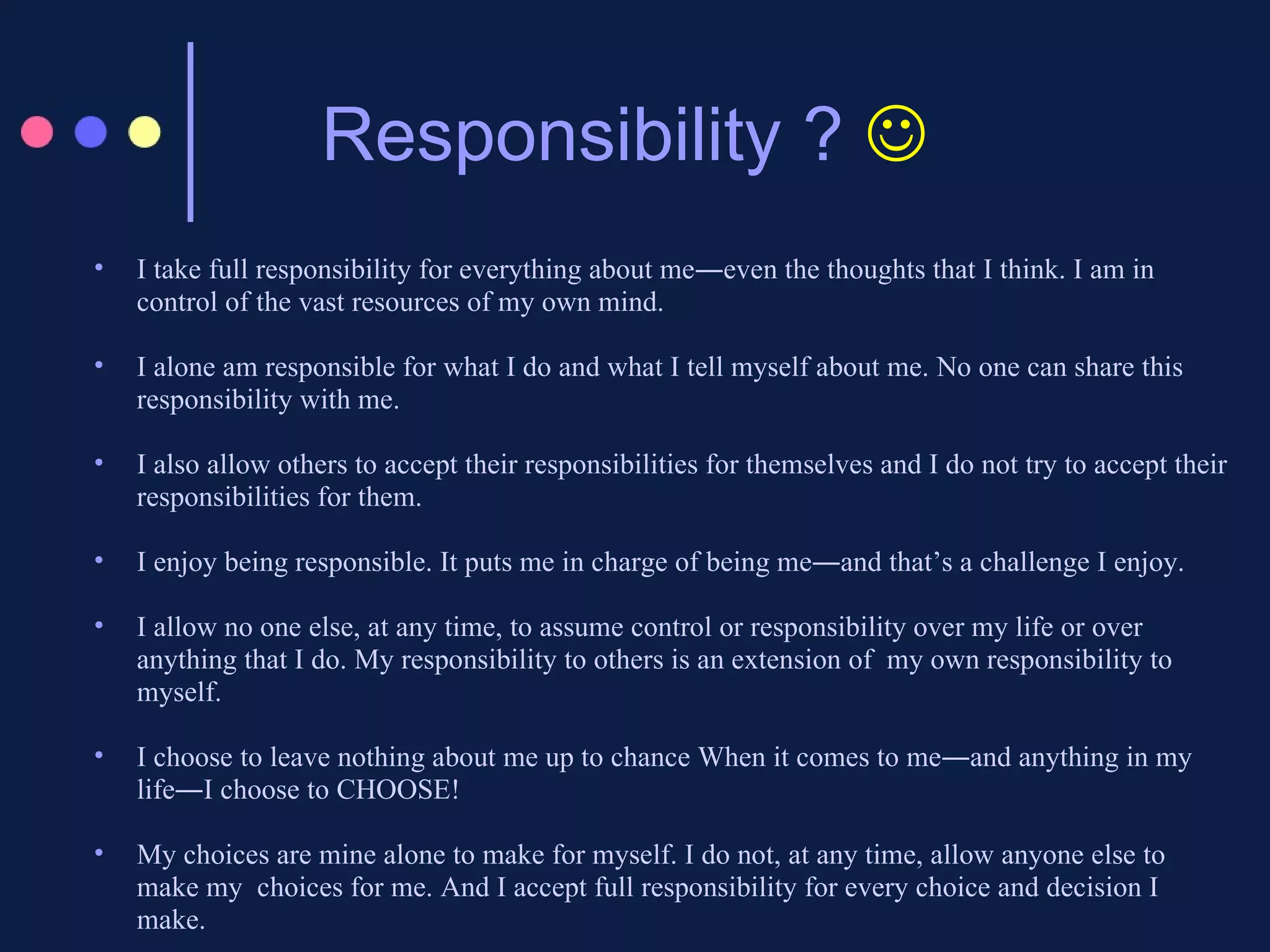 The document discusses taking responsibility for one's thoughts, choices, and actions. It states that one should not make excuses or blame others, but rather take full ownership over their life. This includes being responsible for thoughts, emotions, attitudes, and living in a way that creates strengths and happiness. The document encourages taking on challenges and responsibilities without relying on others to share the burden.