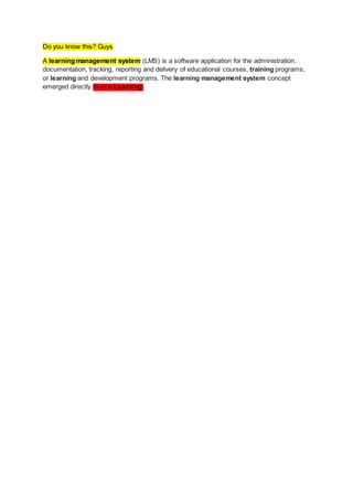 An LMS is a software that allows organizations to administer, track, deliver and report on educational courses and training programs. It emerged from e-Learning to help manage online learning and development programs. An LMS can document courses, track user progress and performance, and report on learning outcomes.