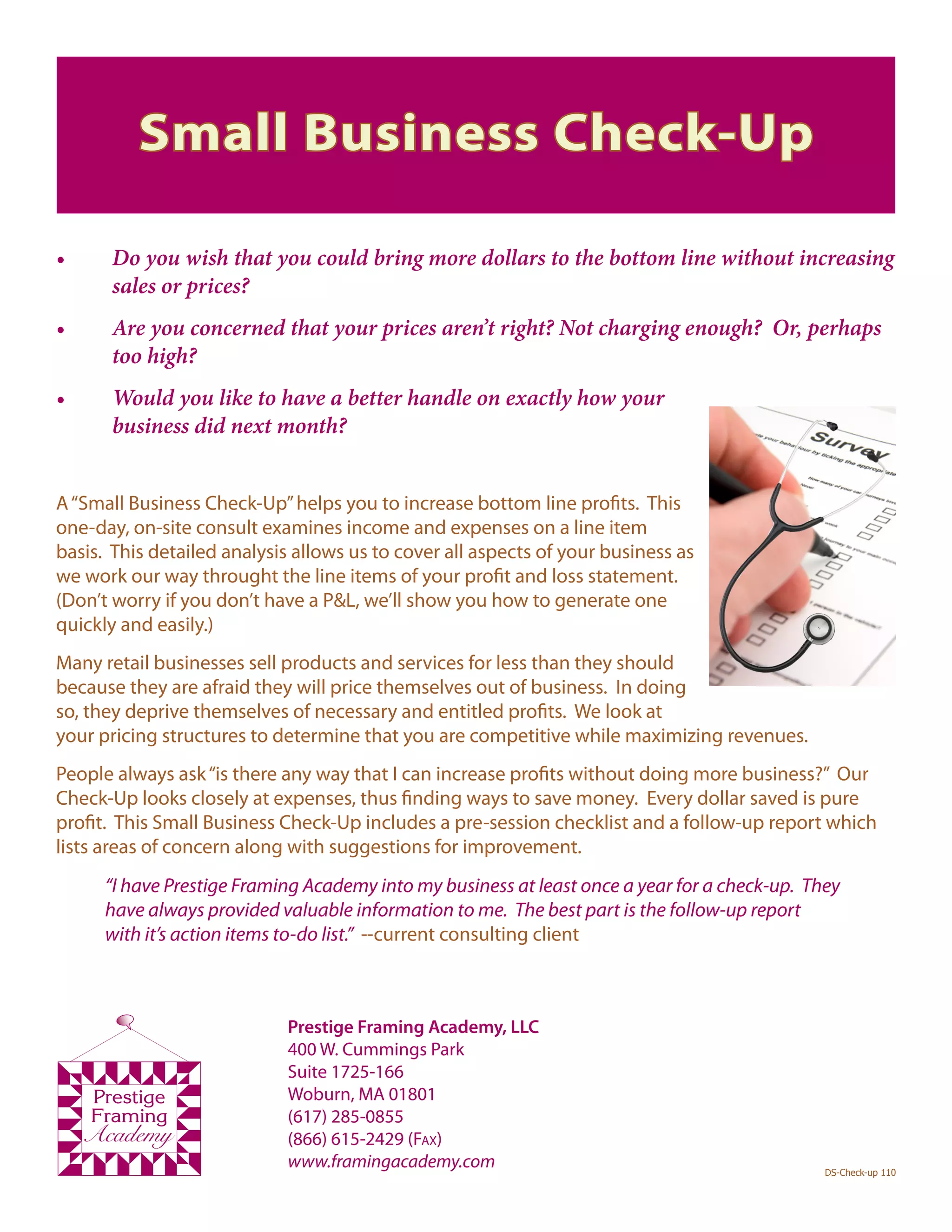 The document describes a Small Business Check-Up service that examines a business's income and expenses line by line to find ways to increase profits. The check-up analyzes pricing structures to ensure maximum revenue and reviews expenses to identify cost-saving opportunities. The service provides an initial assessment and follow-up report with suggestions for improvement. A current client notes that the check-ups have always provided valuable information and an action plan to increase their bottom line.