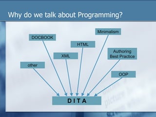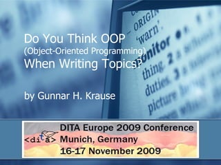 The document discusses how principles of object-oriented programming (OOP) such as abstraction, encapsulation, inheritance, and information hiding can be applied to writing technical documentation topics. These principles aim to reduce complexity, improve handling of complexity, and facilitate change management by categorizing topics as generic, specific, or complex depending on their level of detail and potential for reuse. The document provides examples of how OOP concepts like classes, objects, and inheritance relate to DITA topics and recommends technical writers and information architects reassess their documentation modularization strategies based on these OOP design patterns.