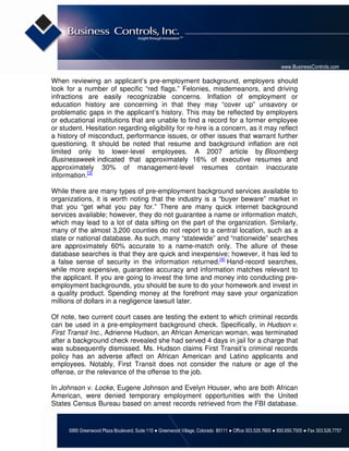 According to an informal study, only 20% of job applicants had no criminal or driving history. 52% of applicants with one offense had multiple issues in their history. Additionally, 30% of resumes contain inaccurate information about work experience, education, or job titles. Thorough background checks including criminal, driving, and education/employment histories can help identify concerning inaccuracies or issues in an applicant's background. However, employers must ensure background check policies do not have an unlawful discriminatory impact and consider the nature and severity of any offenses. Two ongoing lawsuits are challenging hiring policies based on past arrests.
