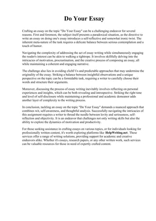 The document discusses the challenges of writing an essay on the topic of "Do Your Essay". It notes that this topic introduces a paradox and requires balancing seriousness with humor. Navigating this complexity involves exploring motivation, procrastination, and the creative process, while maintaining a coherent narrative. Avoiding clichés and striking the right tone of self-disclosure are also challenges. Successfully writing on this topic demands a nuanced approach that combines analysis with self-awareness and wit.
