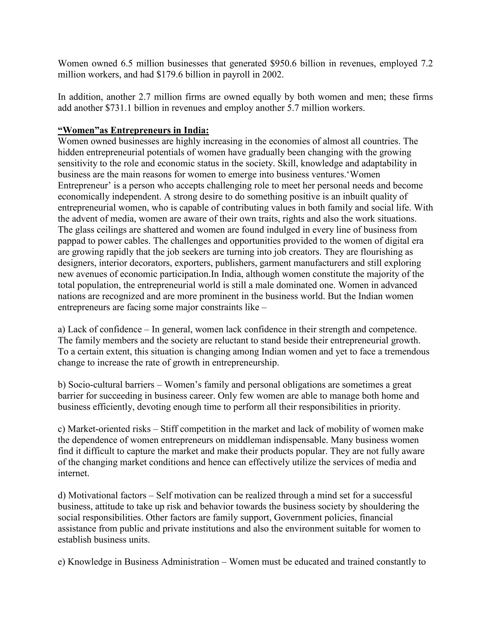 Women owned 6.5 million businesses in the US in 2002, generating $950.6 billion in revenues and employing 7.2 million workers. Additionally, 2.7 million firms were equally owned by men and women, adding $731.1 billion in revenues and employing 5.7 million more workers. The document then discusses challenges faced by women entrepreneurs in India, including lack of confidence, socio-cultural barriers, market risks, lack of business knowledge, and lack of awareness of financial assistance programs. It argues that promoting women's entrepreneurship can help drive rapid economic growth.